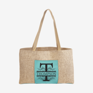 19" x 12" Burlap Bag with 5" Teal Laserable Leatherette Gusset