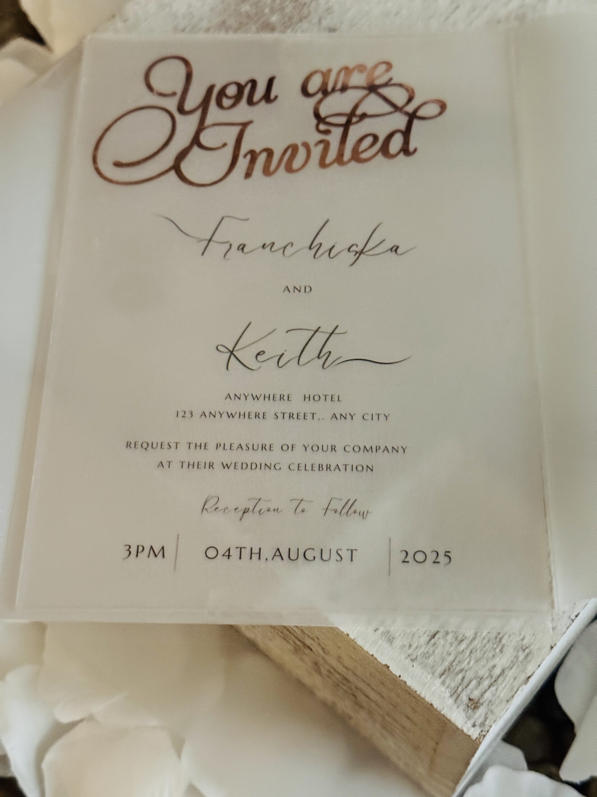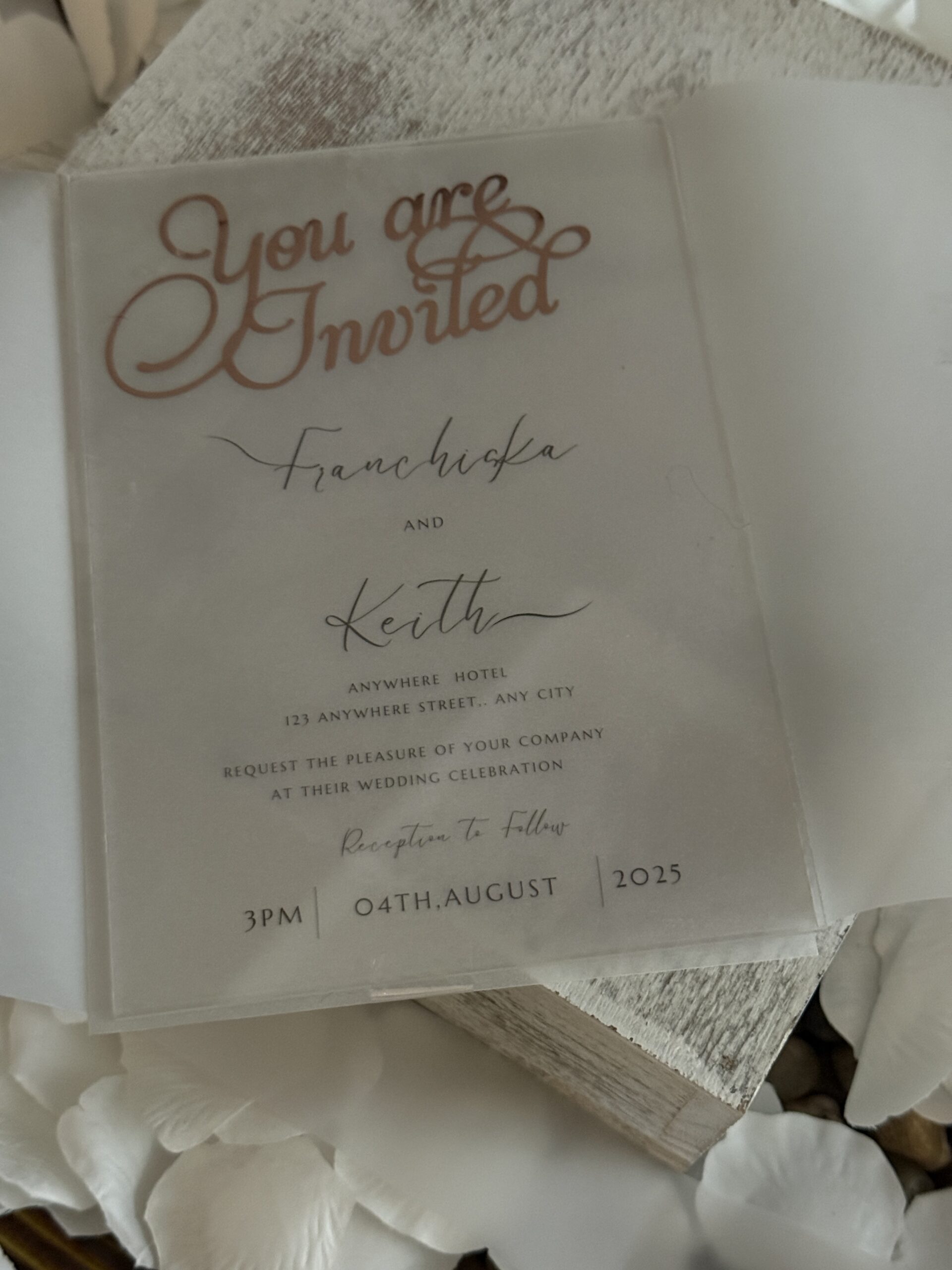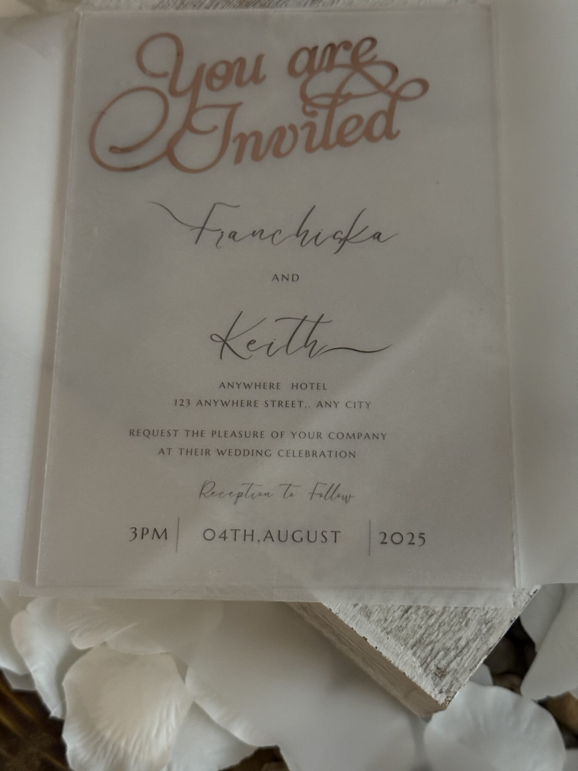 Perfect for modern, elegant, romantic, or minimalist weddings, these invitations blend soft transparency with a high-end acrylic touch-creating a keepsake your guests will want to display.